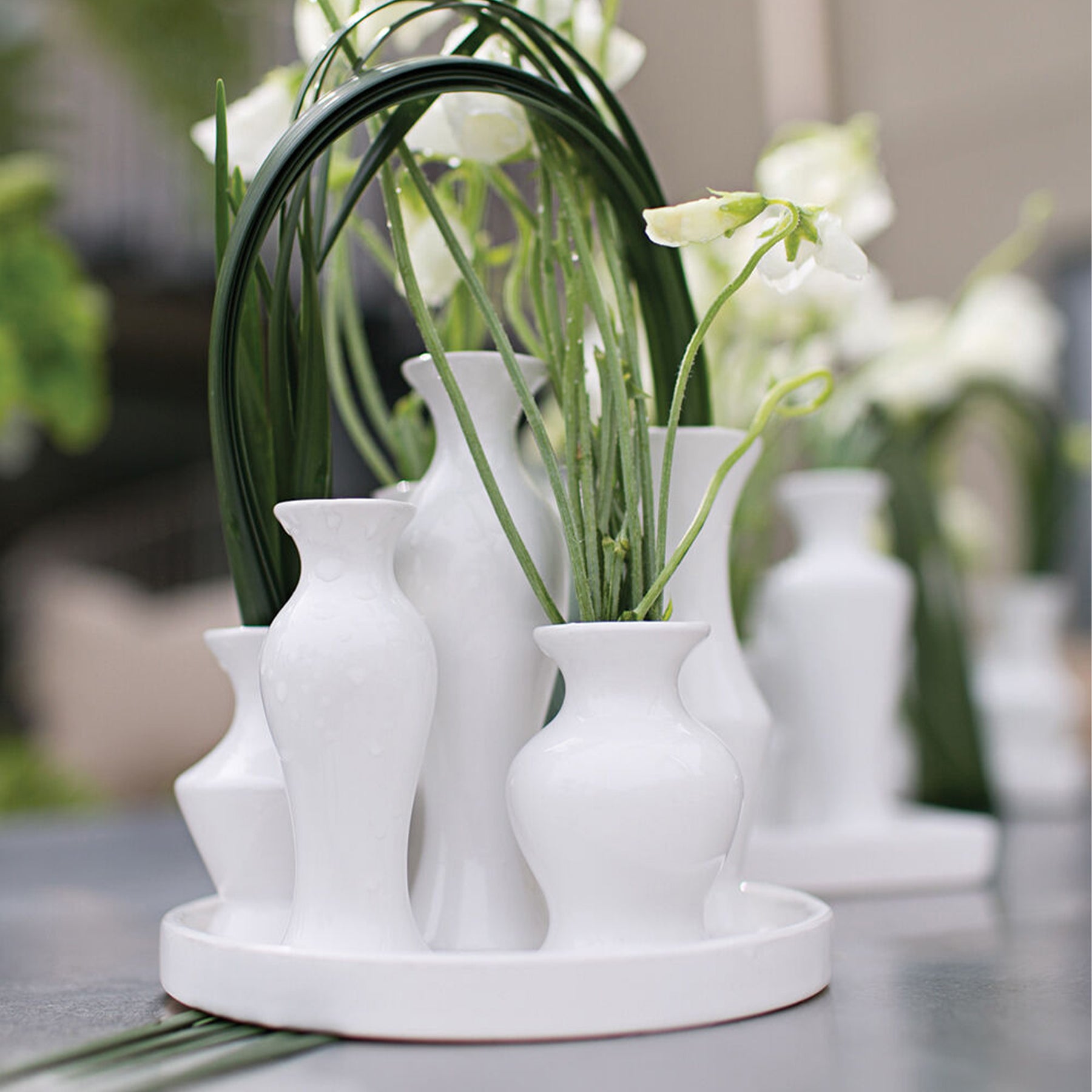 With the Chic Budvase, the name speaks for itself, and the style stands out on its own, with or without stems. Featuring 6 unique ceramic budvases in varying heights and styles attached to a round tray, this watertight piece with a glossy white finish brings dimension and playfulness to everyday or event tabletop centerpieces.