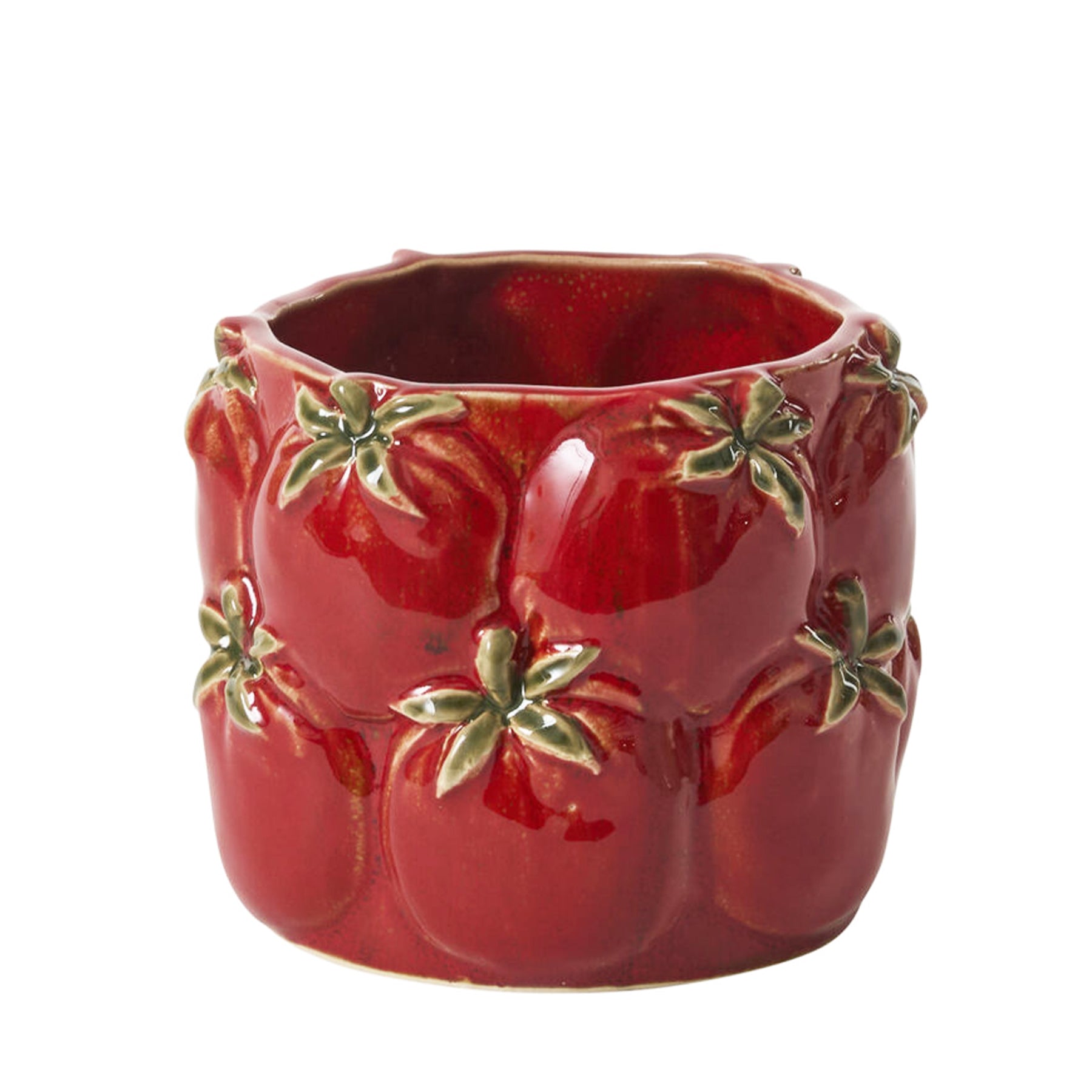 Delightfully playful and delicious looking, the ceramic Cucina Pot is a fresh vessel for a drop-in plant, floral arrangement, or even as a desk accessory. The juicy tomatoes all over these pots are a fun way to capture the food trend in décor.