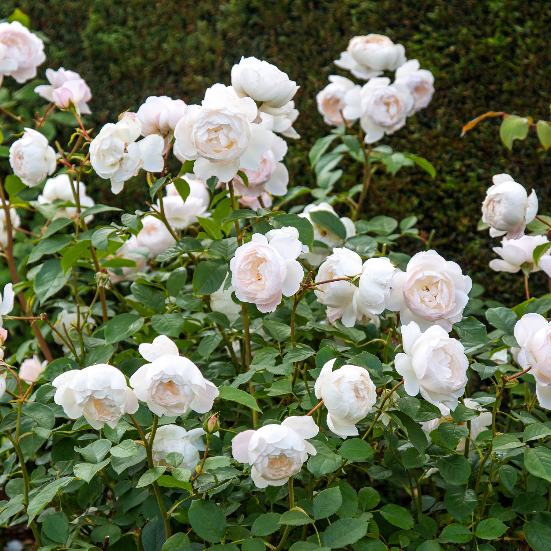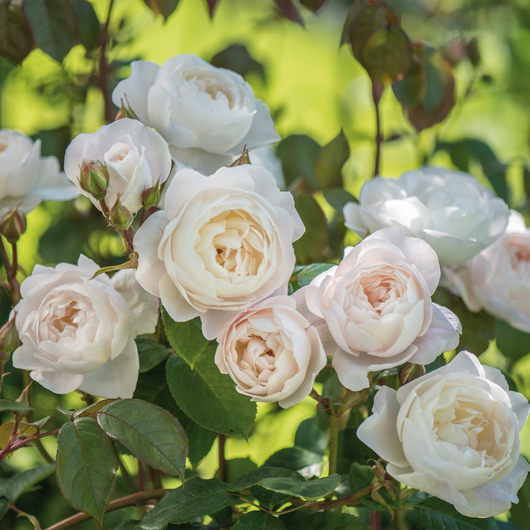Peachy pink buds open to beautiful, white, chalice-shaped blooms, with a pinkish hue. The incurved petals create an arresting interplay of light and shadow. The strong Old Rose fragrance has hints of almond blossom, cucumber and lemon zest. It forms a most attractive neat, rounded, bushy shrub. Named after the tragic heroine of Shakespeare’s Othello.