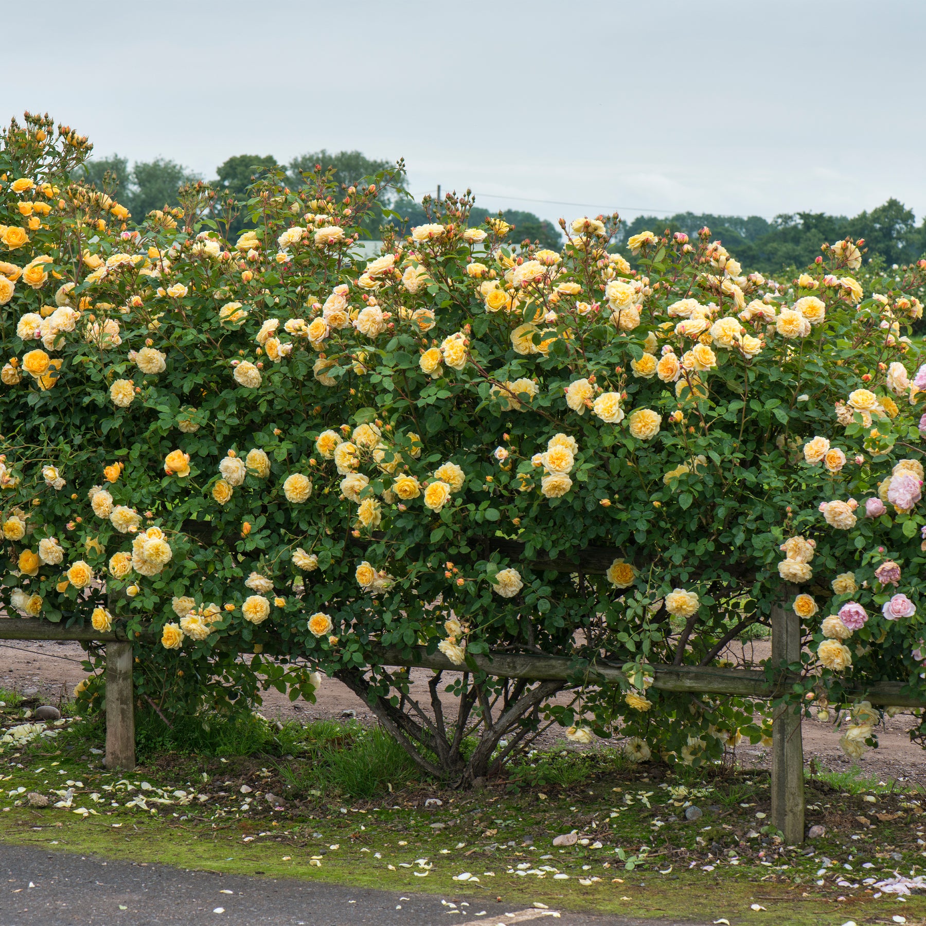 A beautiful climbing rose. The rosette blooms are a rich shade of yellow, the outer petals falling back and fading to palest yellow, providing a most pleasing two-tone effect. There is a lovely Tea Rose fragrance.