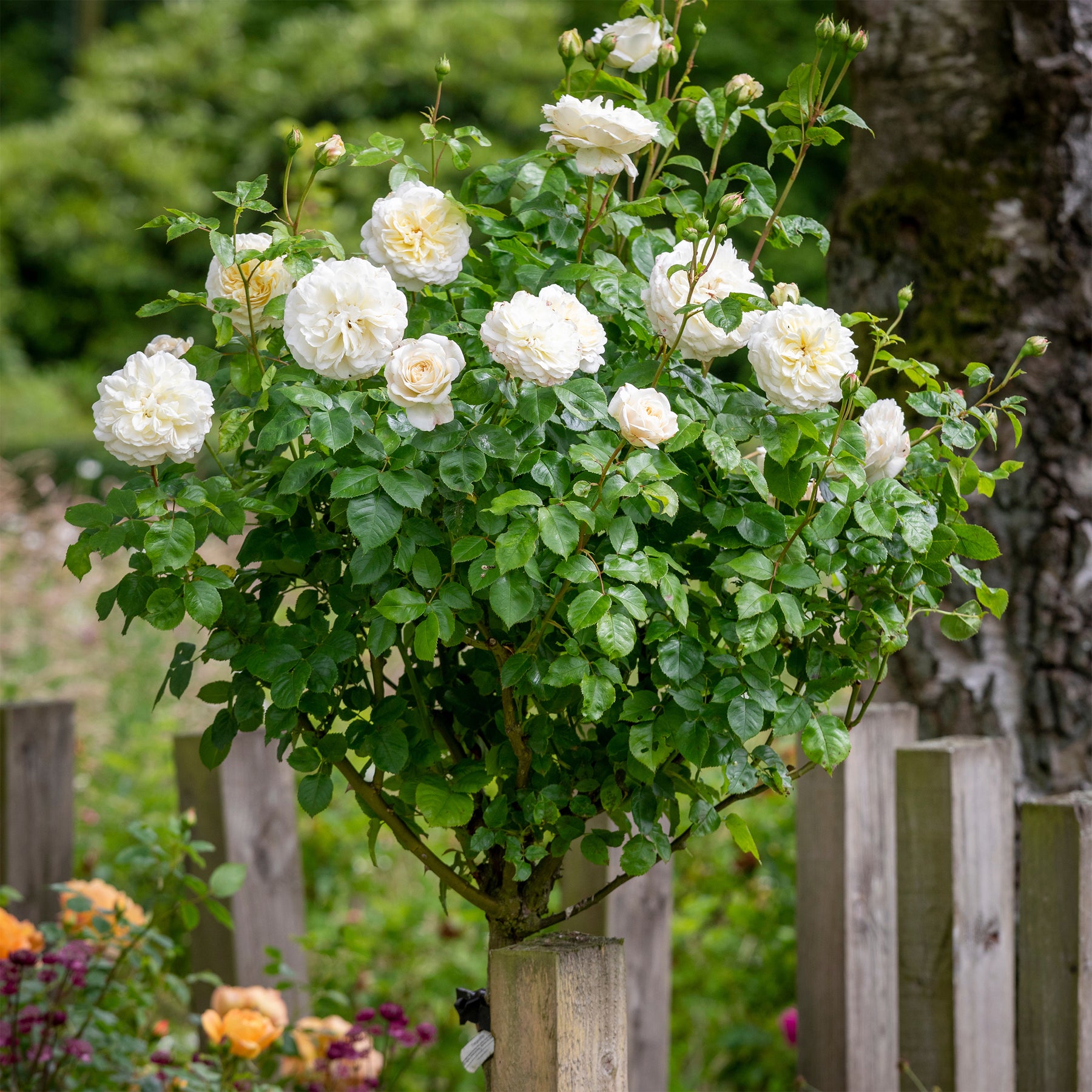 Beautifully rounded flowers, with neatly placed petals making up perfect rosettes. The buds are lightly tinged with yellow but as the flowers open they become pure white. A vigorous shrub; its growth is bushy and upright, clothed in light green foliage, curving outwards in a most attractive manner. With its pure white flowers, this rose lives up to its name.