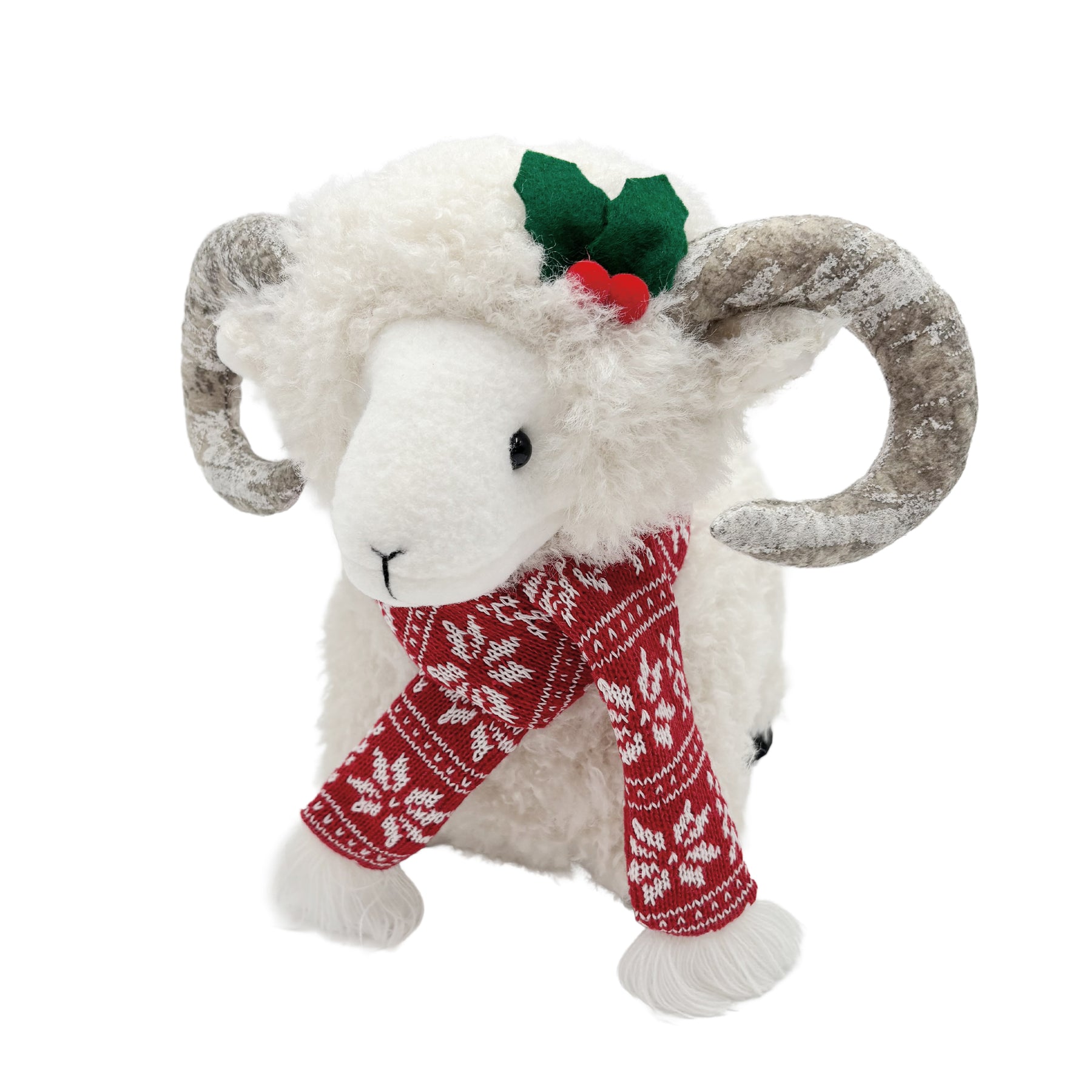 An adorable fabric lamb with a festive scarf and holly leaf accents.