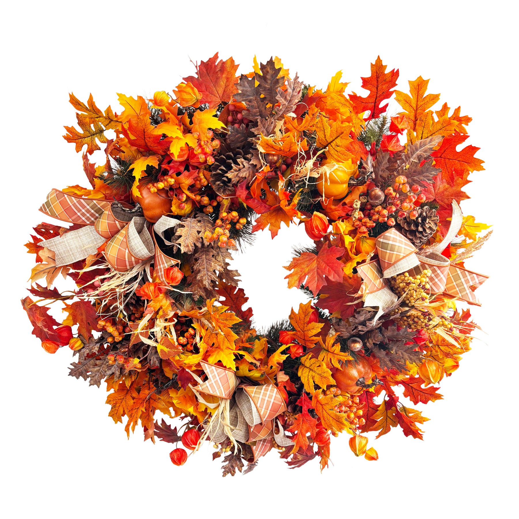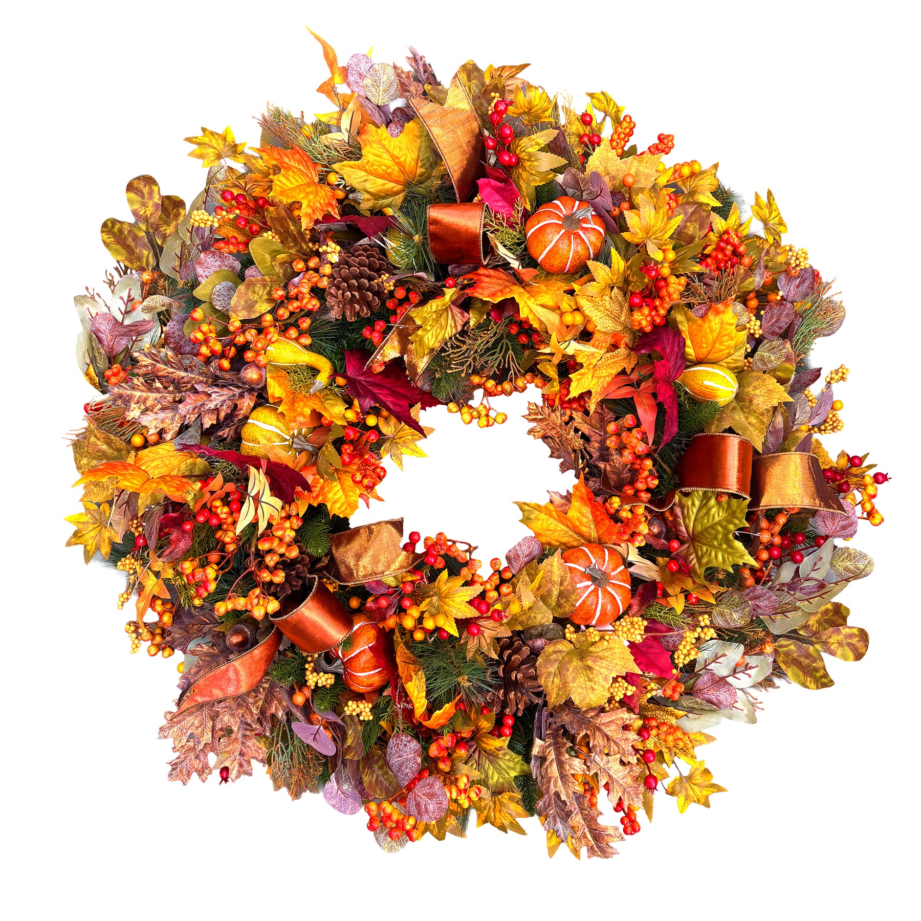 Our Deluxe Fall Collection will adorn your home with the most beautiful arrangement of autumn colors. Plaid and burlap ribbon swirl around leaves and berries in a range of hues from green to gold to coppery dark orange. Pinecones and mini pumpkins are abundant accents. Dress your home in rich-looking fall and Thanksgiving decor.