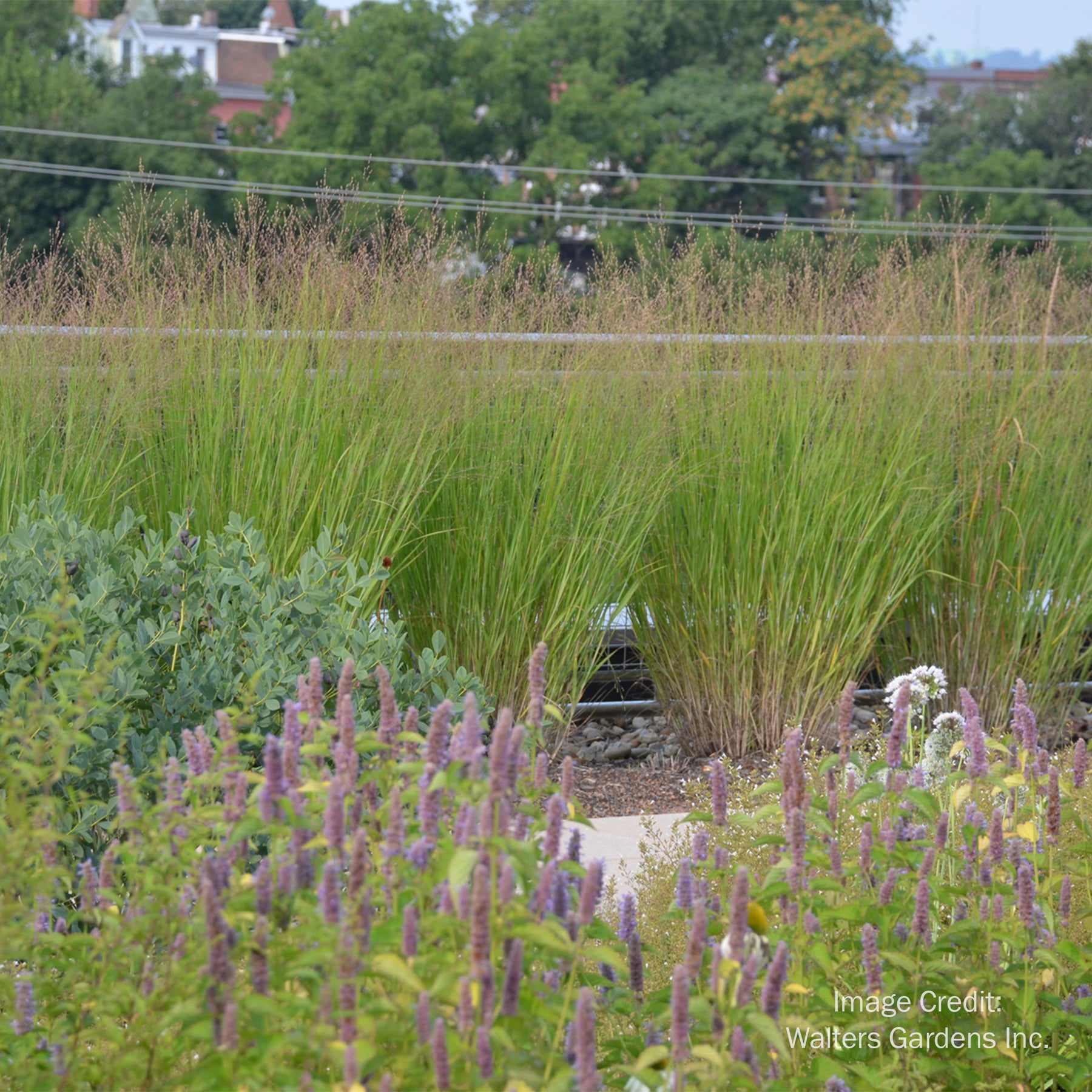 Blue Switch Grass forms a columnar, clump-forming, warm season grass. Metallic blue foliage turns yellow in the Fall. Blooms are finely textured, pink-tinged, branched flower panicles. Seed plumes persist in winter, providing seeds for birds. It is native to western USA, naturalized in PA. Native grasses are an essential larval host for most banded skippers and most of the satyrs (butterflies).