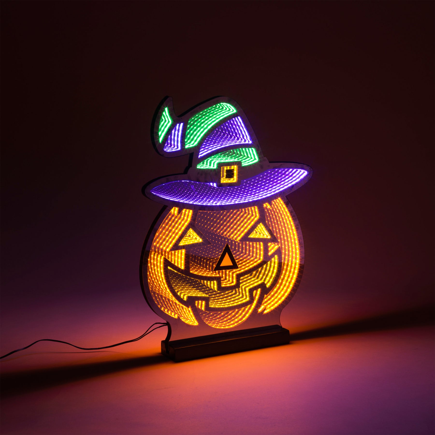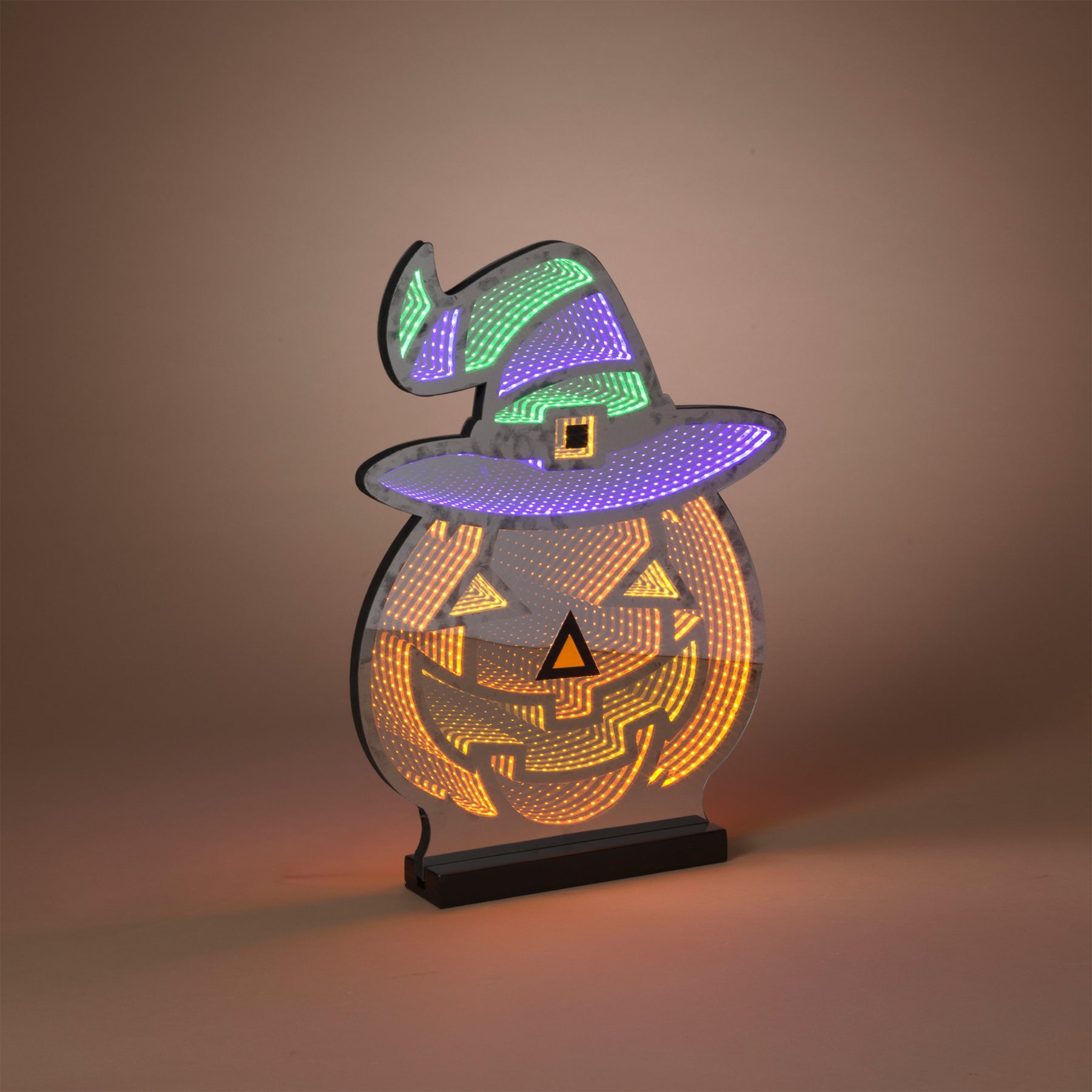 Celebrate Halloween in style with this infinity lighted Jack-O-Lantern in a witch’s hat.