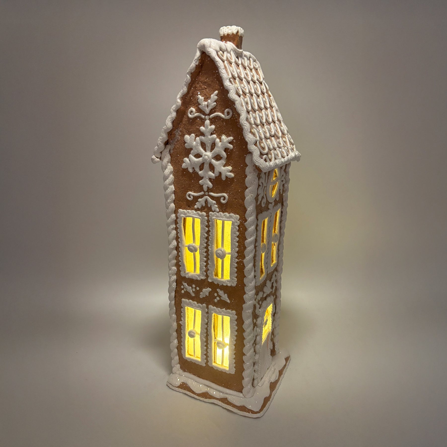 A fine layer of faux white icing brings an elevated look to this gingerbread house table top.