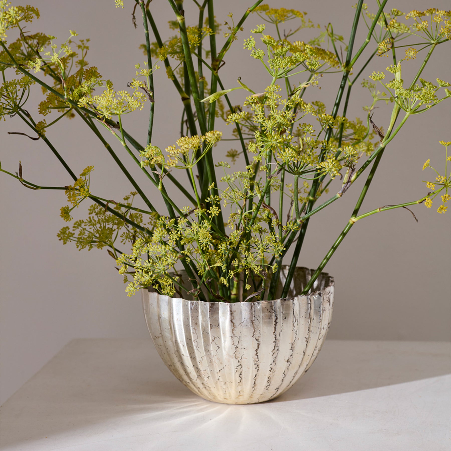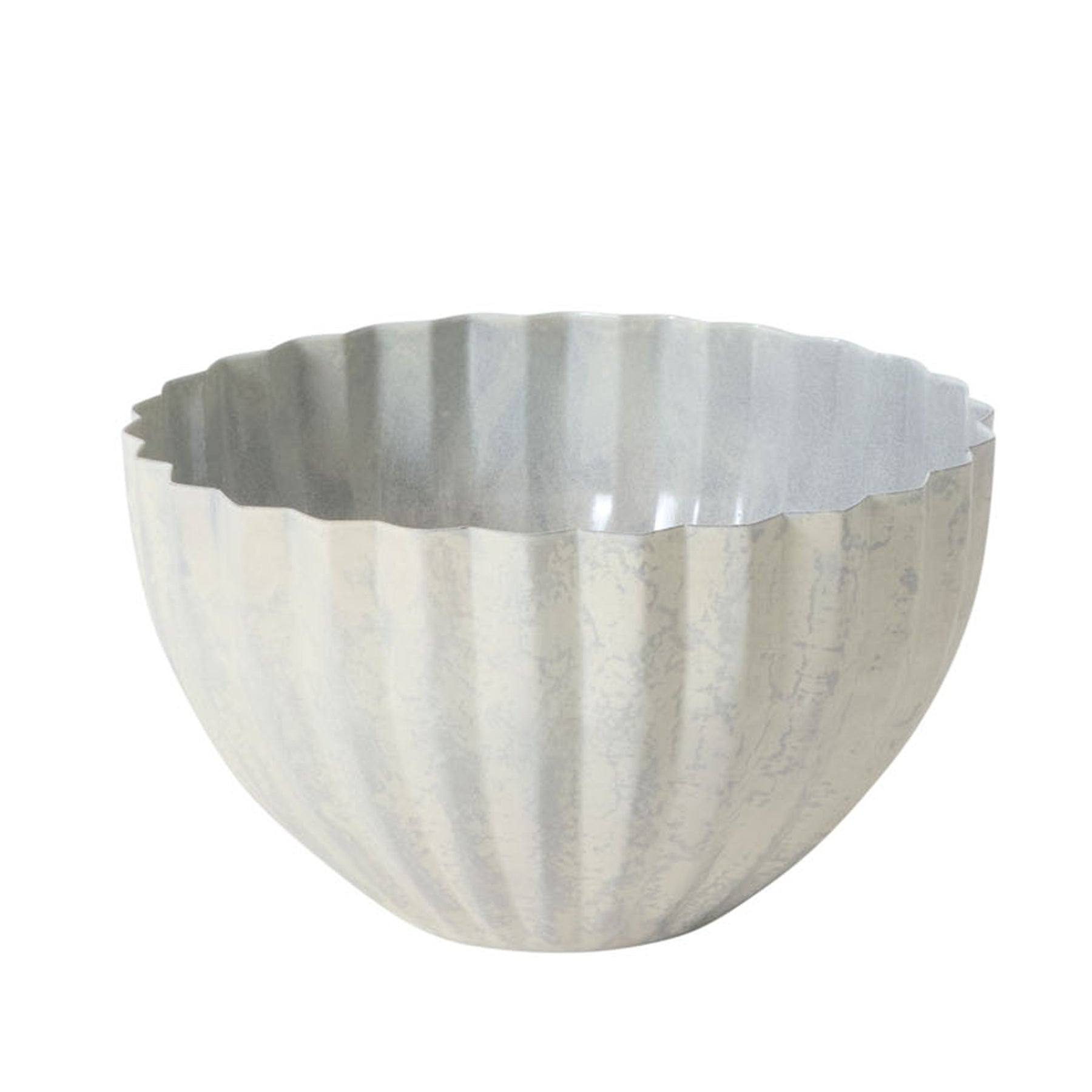 Bring rustic charm, a modern shape, and neutral hue to table settings with the lightweight Monarch Bowl. Made from pressed sheet metal with clean pleats and a white opalescent finish with beautiful color variation, this low bowl makes a striking statement for everyday home decor or wedding and event design. This vessel is stunning with florals, succulents, or a drop-in plant.