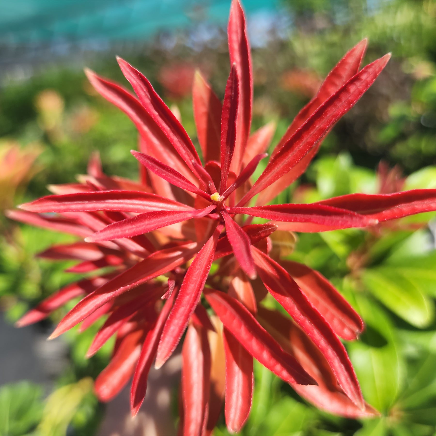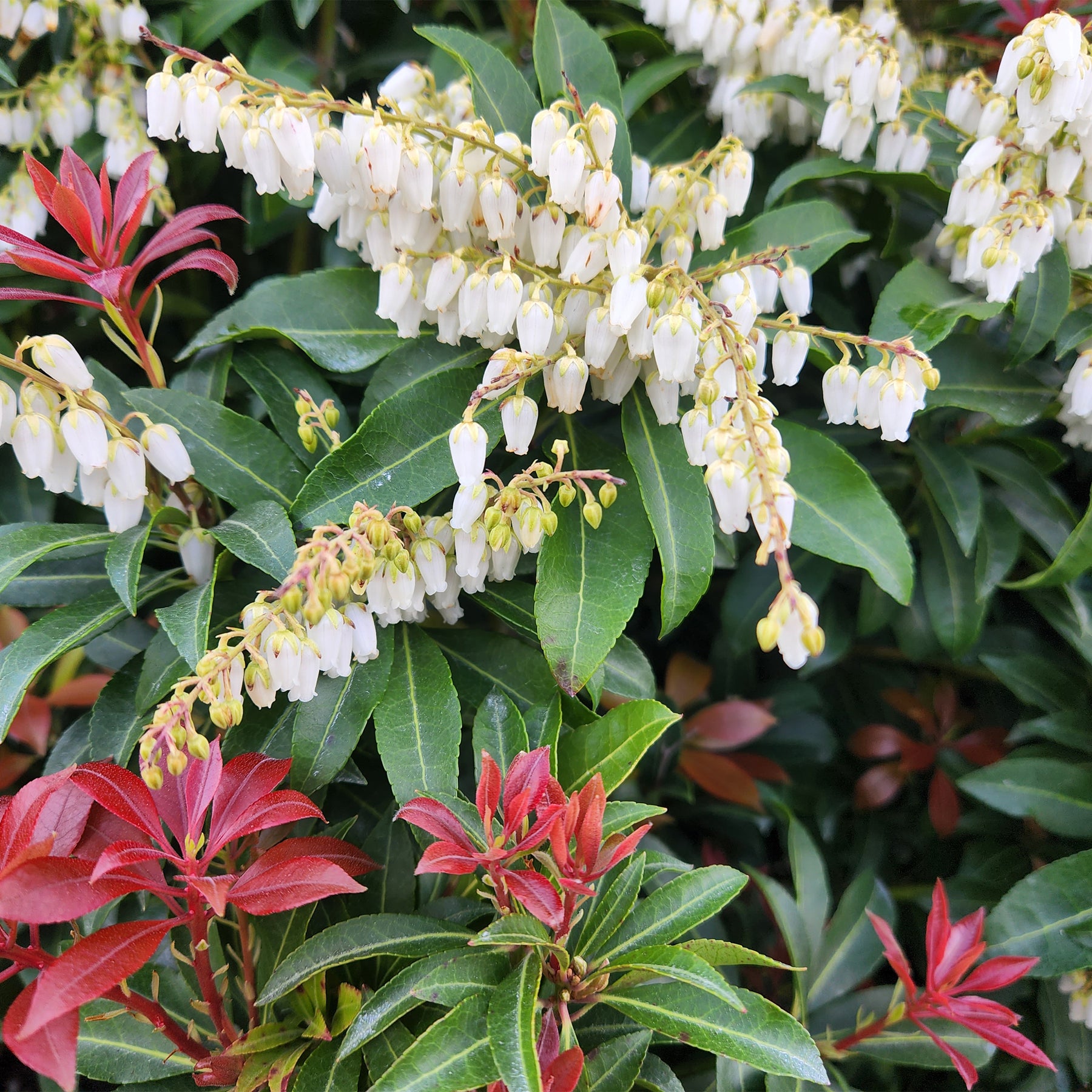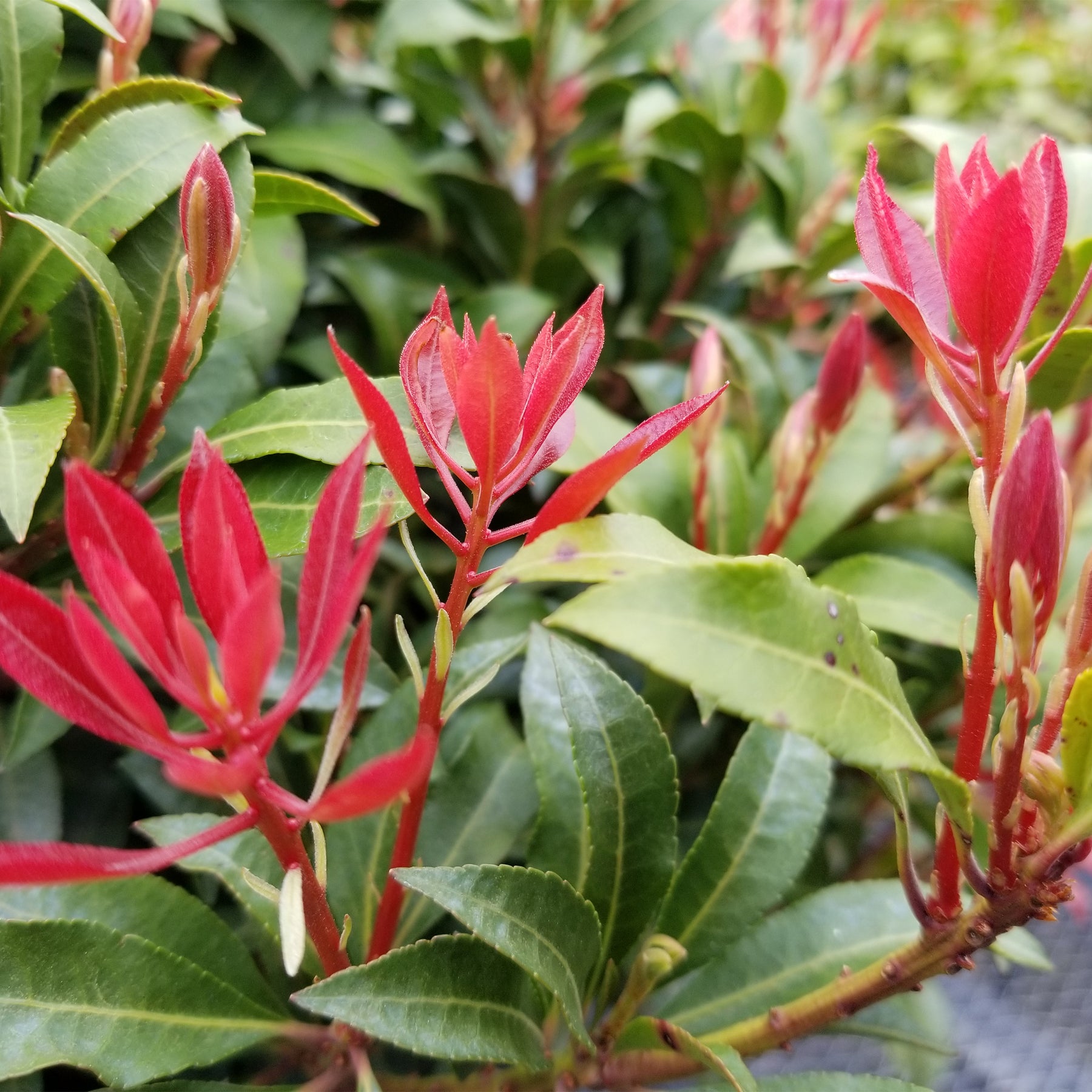 Fiery red new growth rises from the lustrous evergreen foliage then ages to a deep green. Profuse, broad, drooping clusters of white flowers cool the flames, creating a breathtaking spring show. An ideal shrub for use in a foundation planting or landscape groupings, and an excellent companion shrub for azaleas.