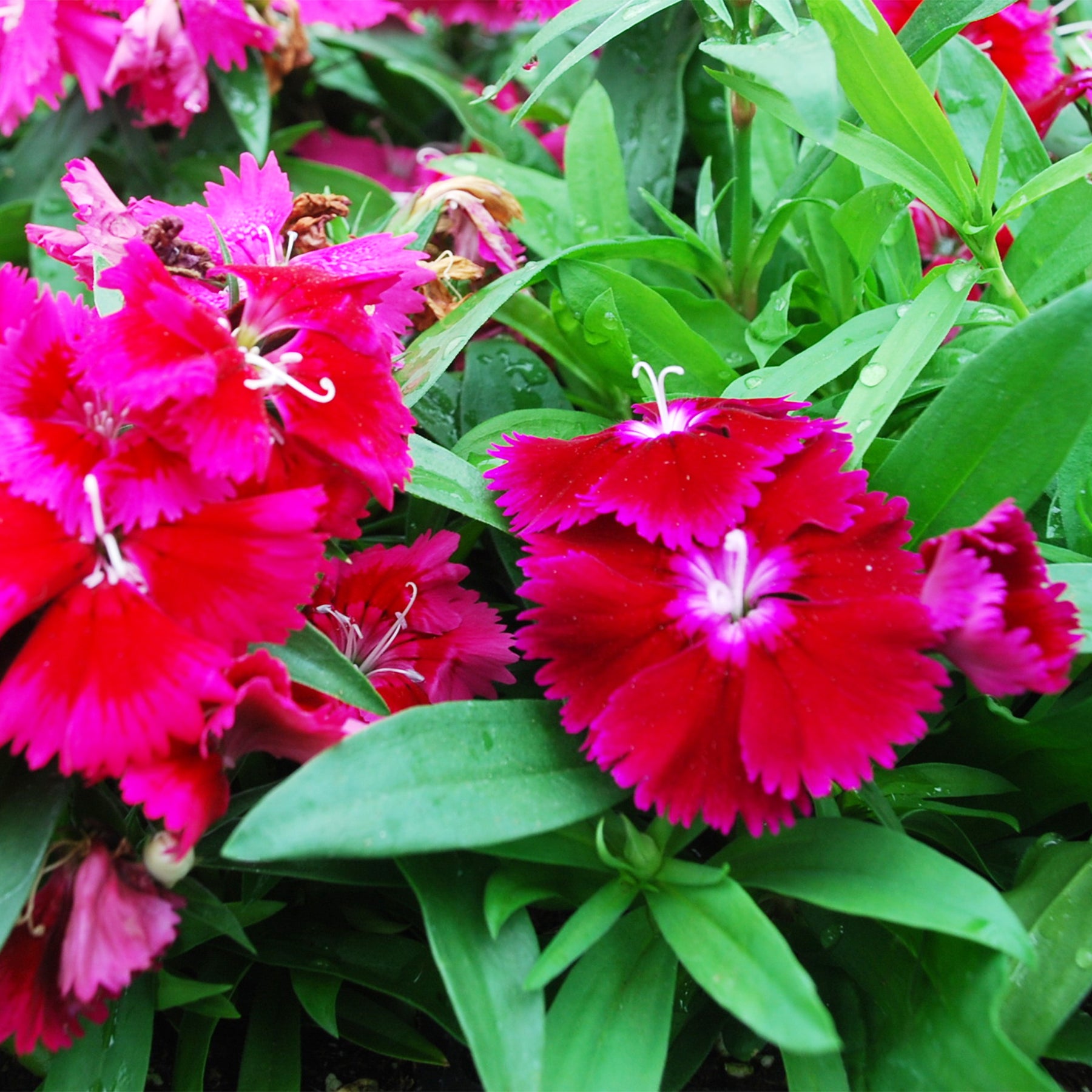 The Pinks' genus Dianthus is massive with over 27,000 named cultivars in a variety of annuals, biennials, and evergreen perennials. Its common name comes from its flower shape that looks like it has been clipped with pinking shears. The colors range in hues of pink, purple, red, and white -- and many variegated color combinations. While it is deer resistant, the bunnies will eat Pinks to the ground. Pinks make a wonderful cut flower. Available in flats and pots. Please give us a call or use the contact form below to place an order or to confirm availability.