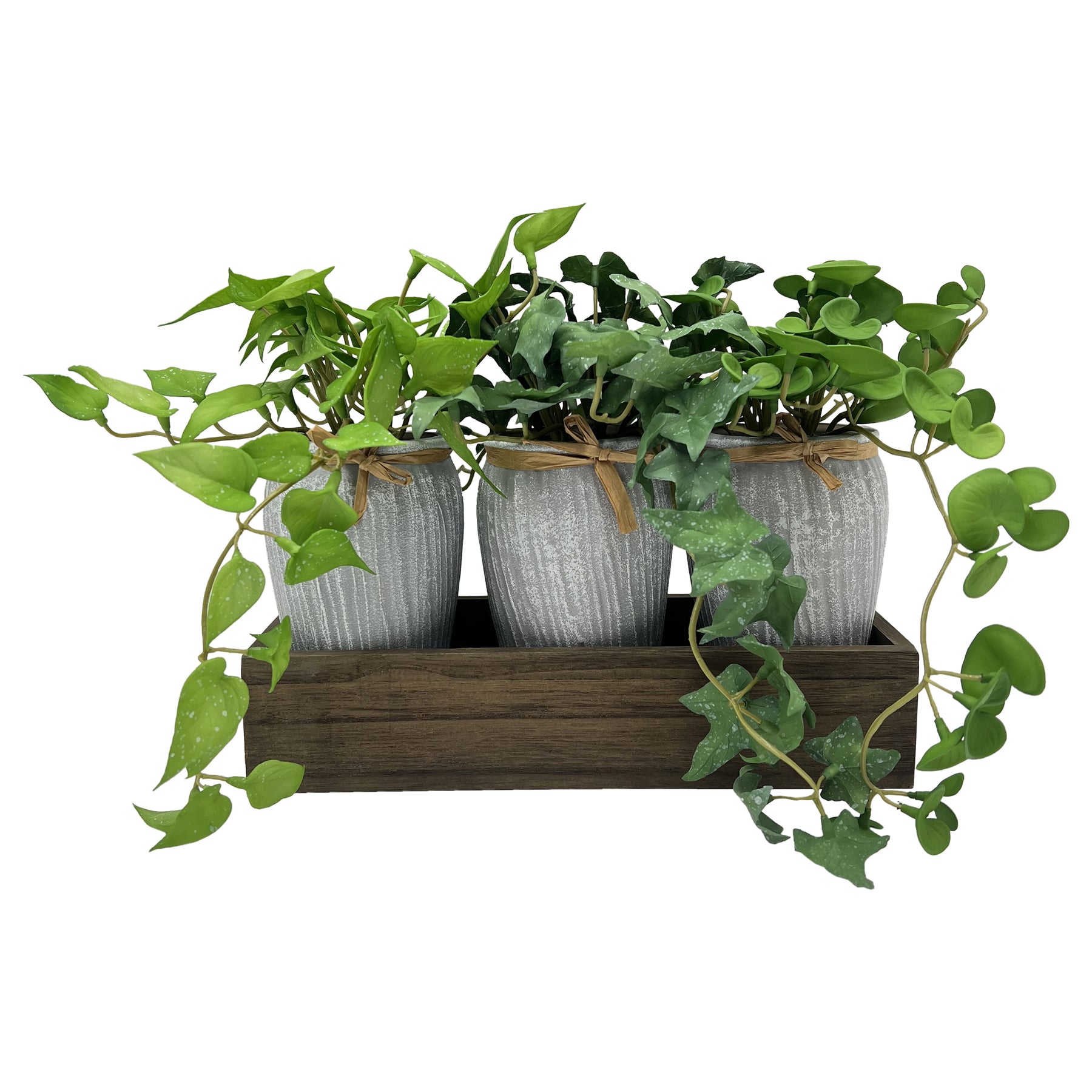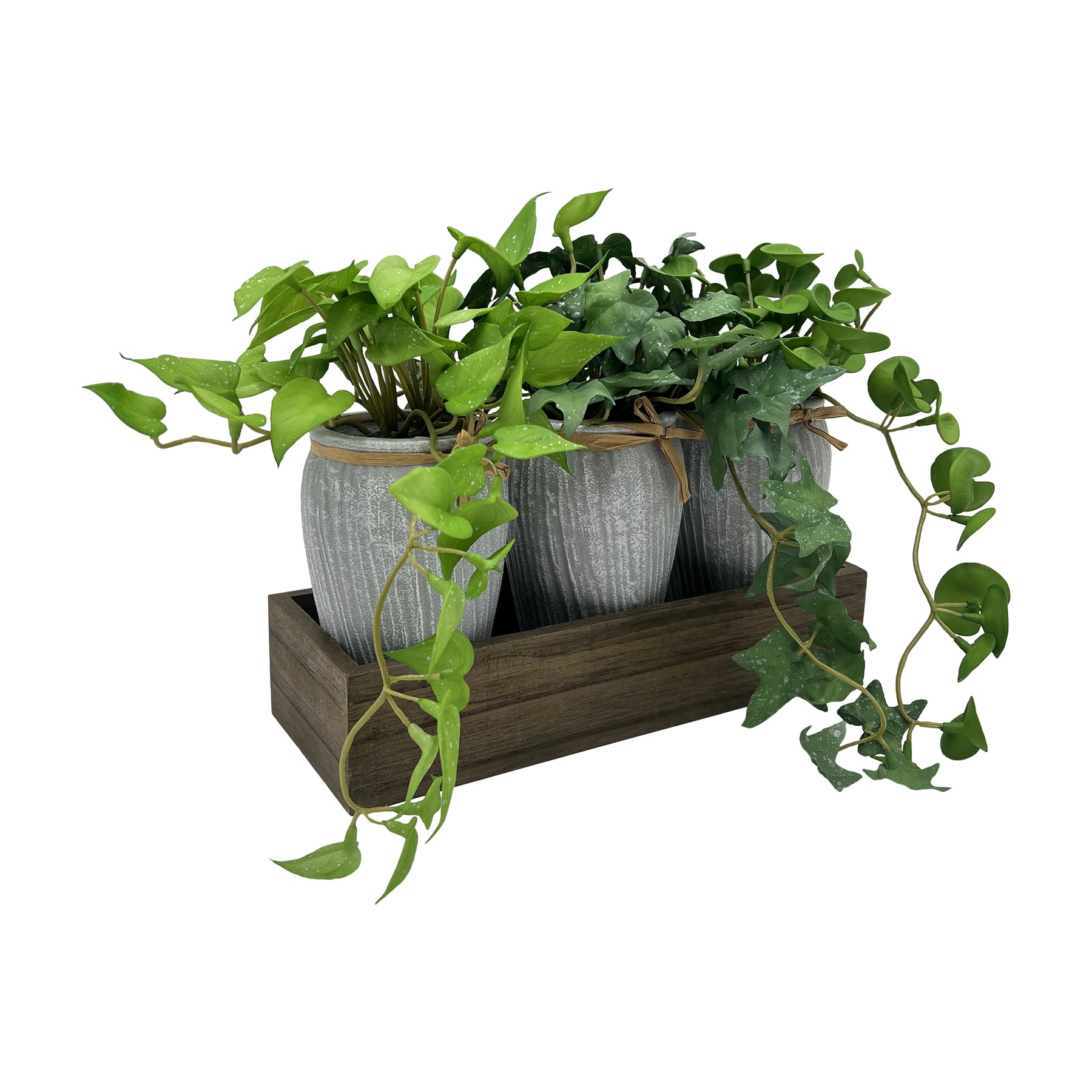 These three ferns in a wooden tray are perfect for those looking to bring some green into their home without the commitment to a watering schedule. Let them spruce up your home while you sit back and relax. Dimensions: 9” H x 4” W x 11” L.