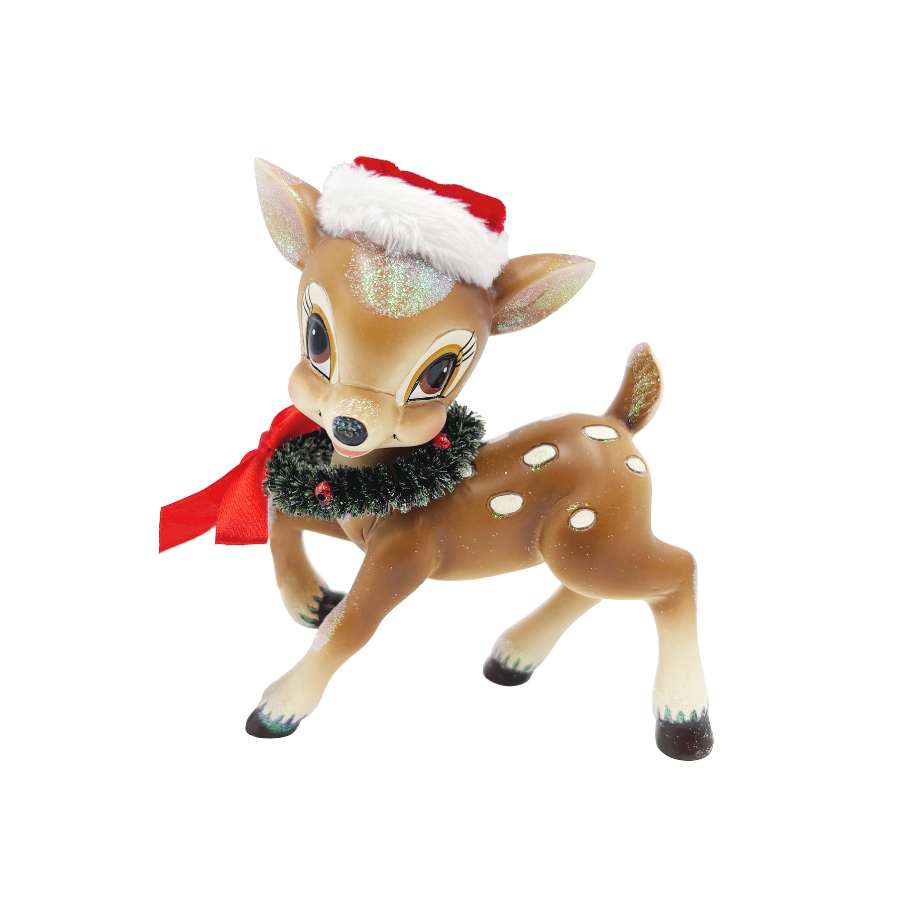 This vintage reindeer fawn is showing off its Santa hat and seasonal ribbon.